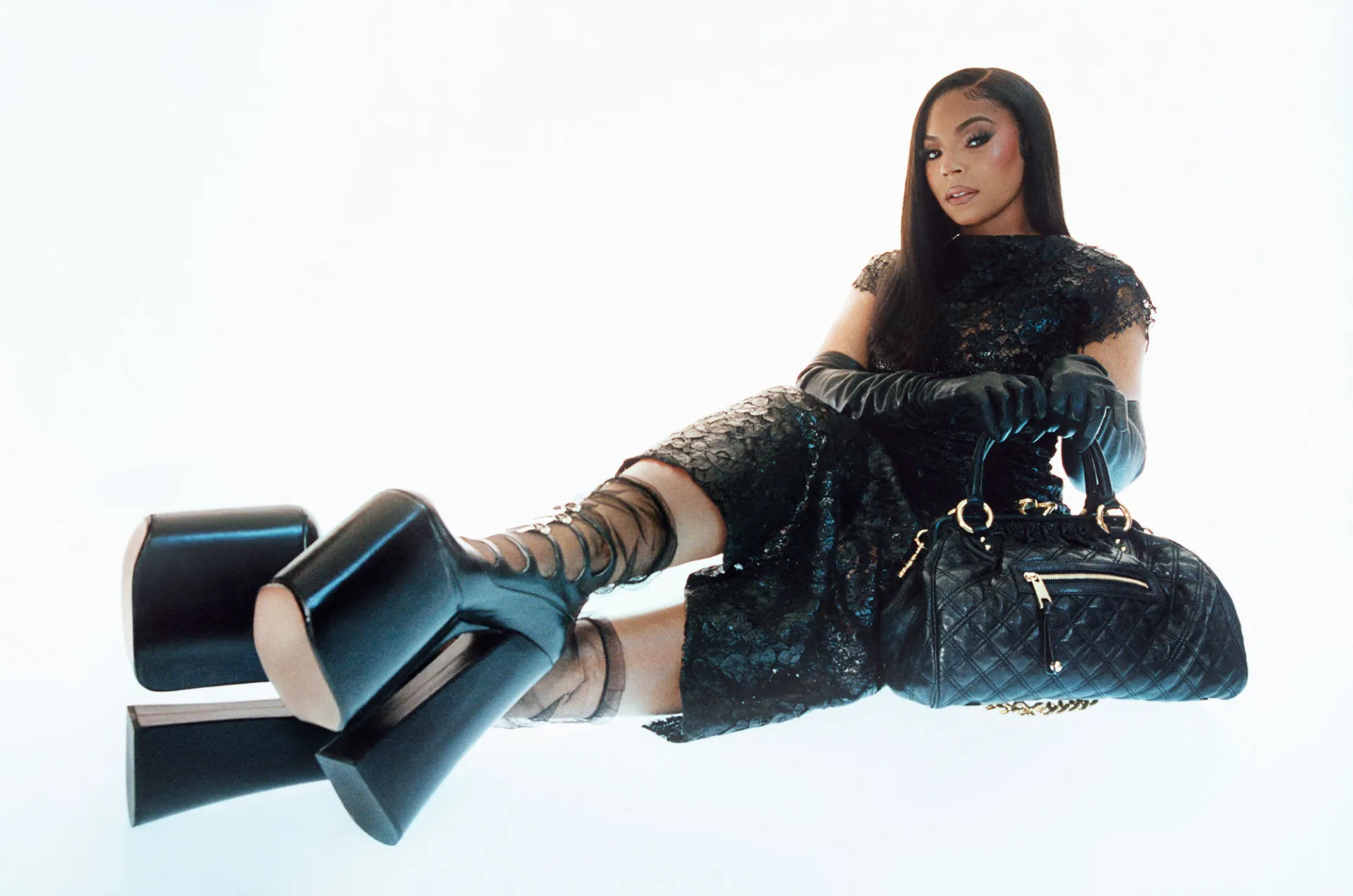 Ashanti, 42, who dropped her self-titled debut album in 2002, was the epitome of glamour in a black lace dress, leather gloves and platform heels. The all-black ensemble perfectly complemented the black Stam Bag.