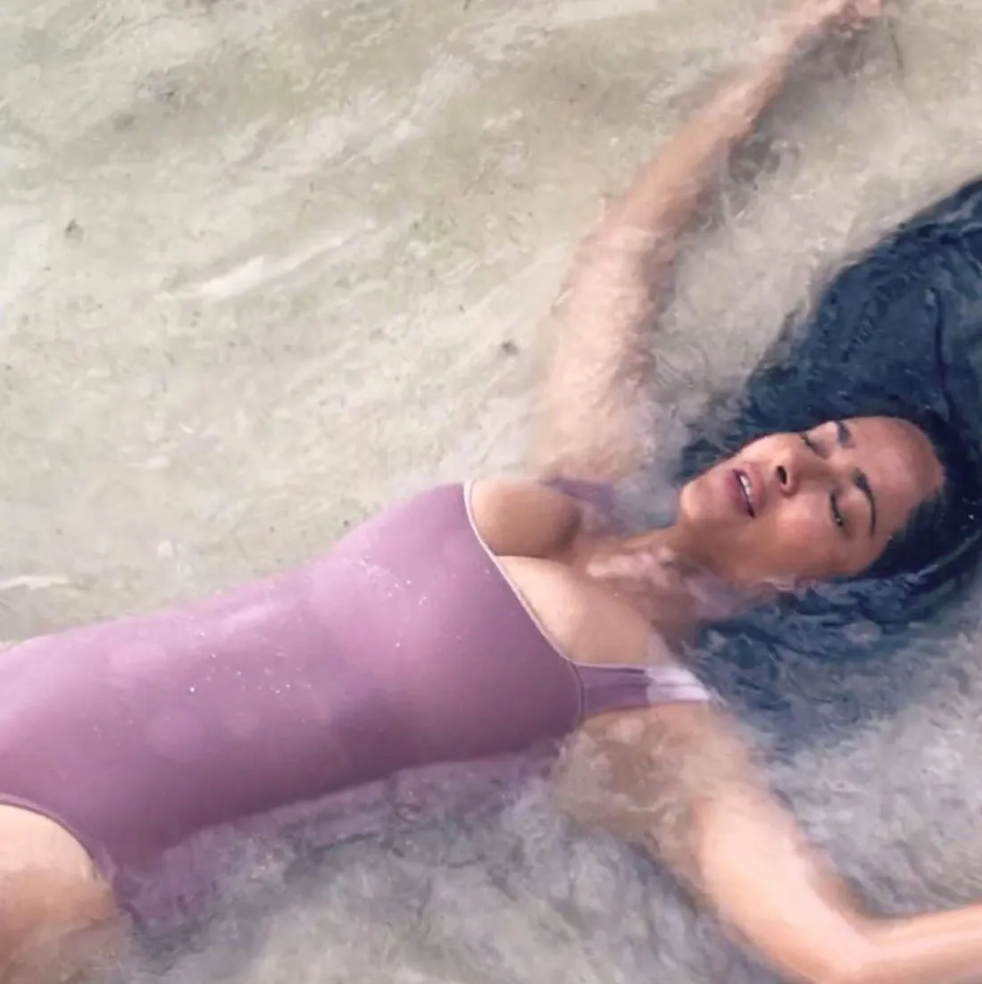 On Tuesday, August 20, Hayek posted ten photos of herself submerged in a shallow water at the beach. She wore a revealing, lavender one-piece bathing suit with a square neck and let her long hair down for the camera. Hayek was photographed laying down in the water, letting the waves wash over her completely. The photo series captured a time-lapse of her being totally engulfed by the waves.