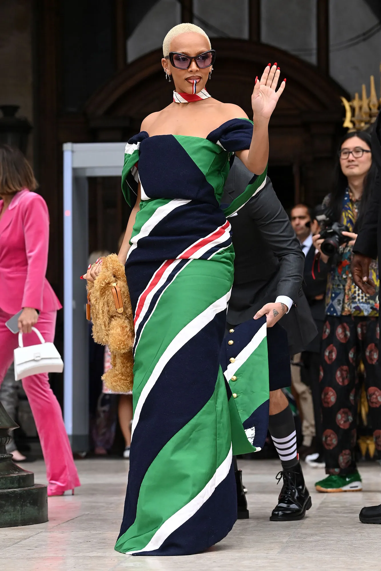 Another eye-catching getup from the musician was her look at the Mônot fashion show during Paris Week in October 2022. Doja debuted a cutout dress with one strap tying around her neck. The look didn’t stop there, though. Her arms were painted black and looked like gloves, adding more dimension to the outfit. Her nails were finished with sharp black points. As for glam, the “Talk Dirty” singer rocked face paint that included blue contour and a bright red lip. For jewelry, she kept it simple with diamond earrings that reached her collarbone and a glitzy necklace.