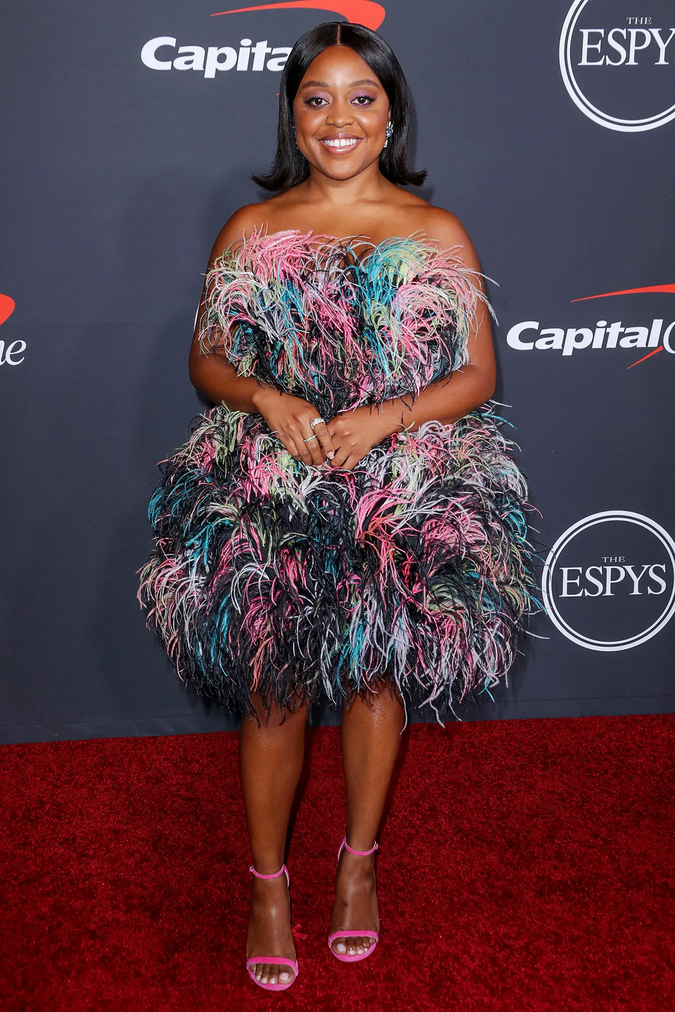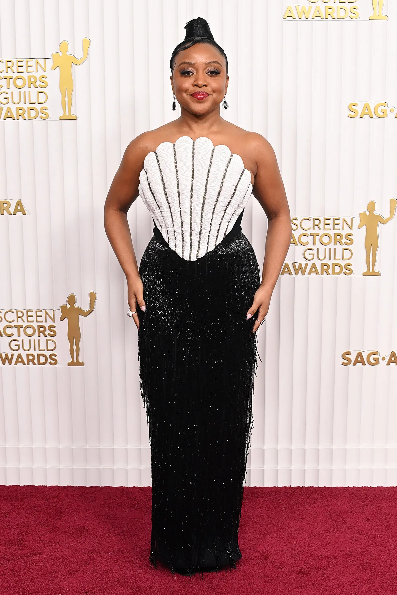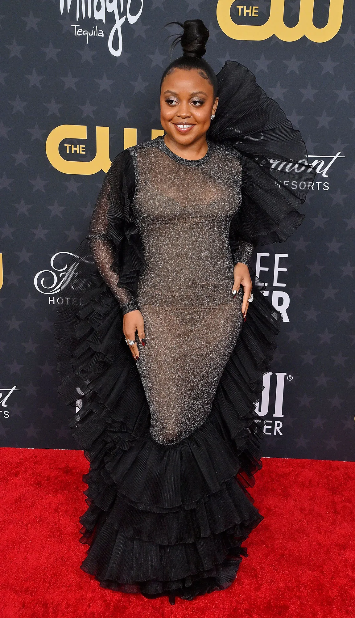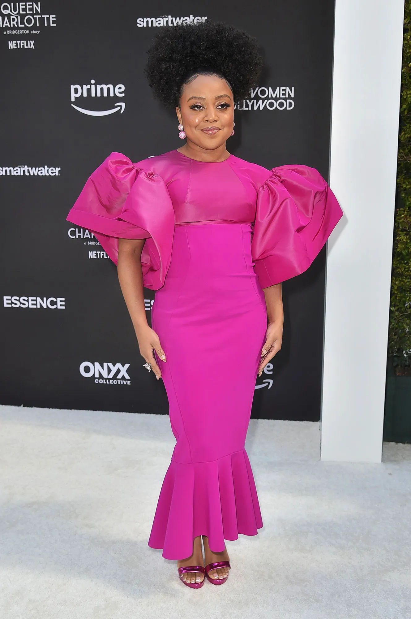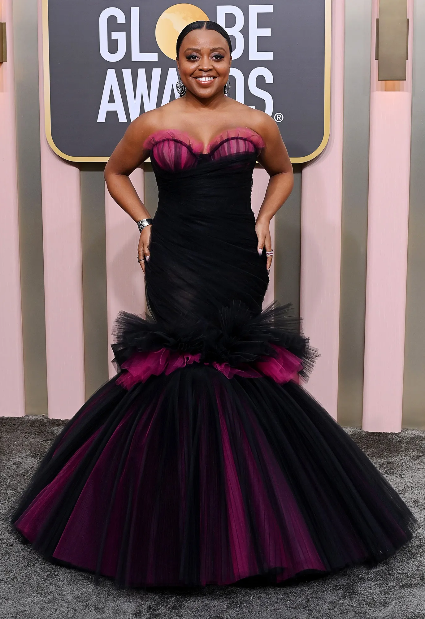 For the 80th annual Golden Globe Awards in Los Angeles in January 2023, the Abbott Elementary creator looked like a goth Barbie in a black and pink tulle dress by Christian Siriano. The floor-length garb featured a sweetheart neckline and a billowing skirt. Quinta complemented the number with a sleek ponytail and a smoky eye.