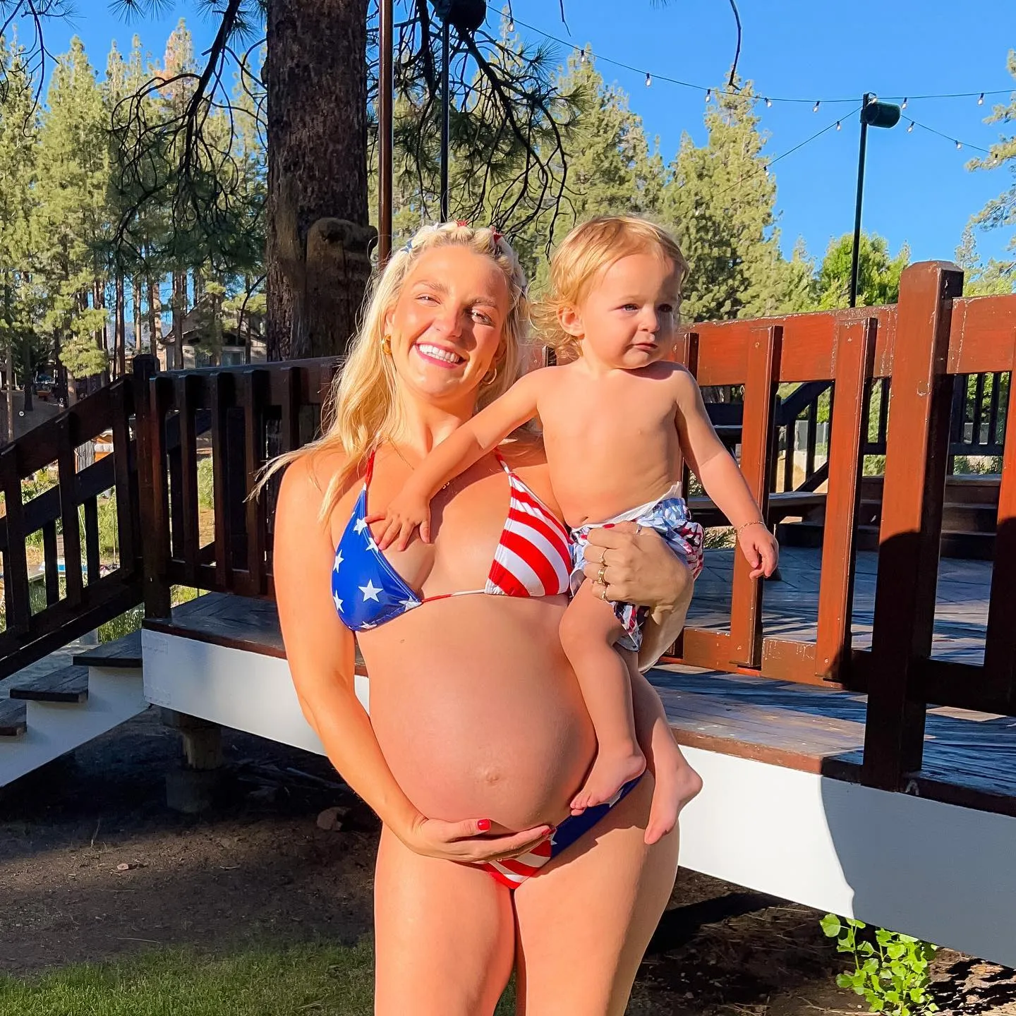 R5 member Rydel Funk dazzled us in a Stars and Stripes bikini in July 2022. To celebrate Independence Day, the “Loud” artist shared her asymmetrical two-piece via Instagram. The top featured a star pattern on one side, and red and white stripes on the other. Her bottoms adorably matched the top, and to top the look off, she alternated red, white, and blue clips in her hair. The blonde beauty held her one-year-old son, Super, in the carousel of photos, who was also wearing a red, white and blue tie dye bathing suit.