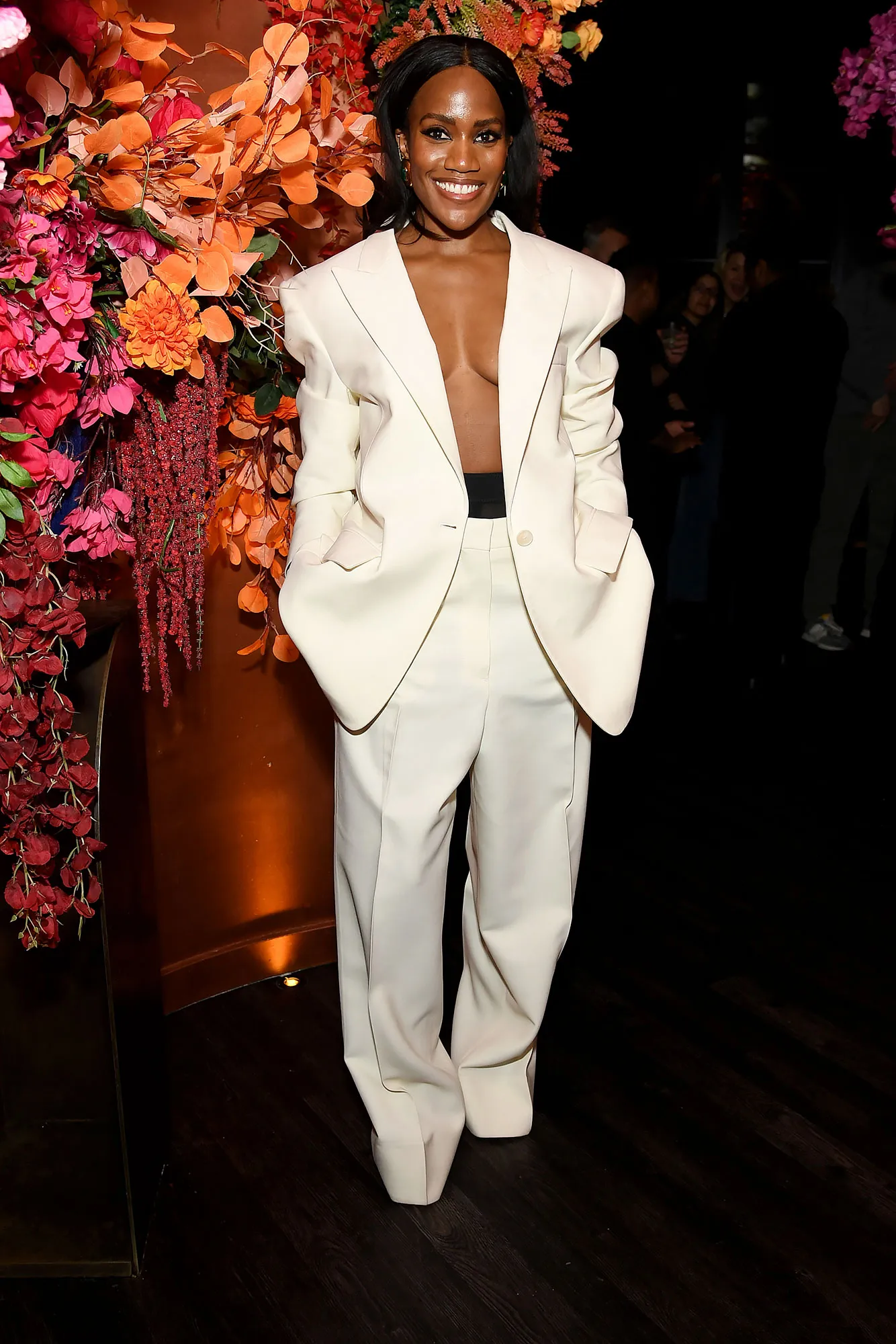 Take Wood, for example, who left little to the imagination in a barely-there backless frock with a plunging neckline that exposed her navel. She let the dress speak for itself, opting for a sleek blowout and bronzy glam.