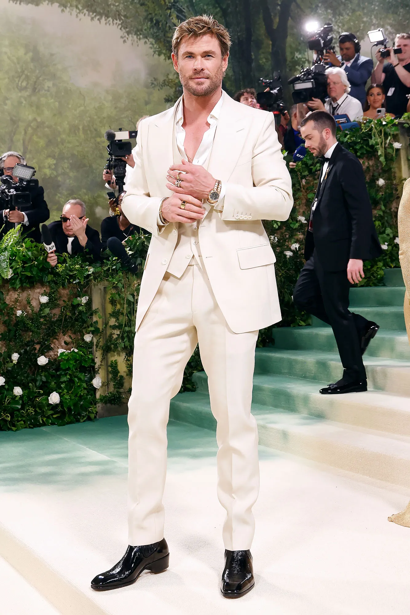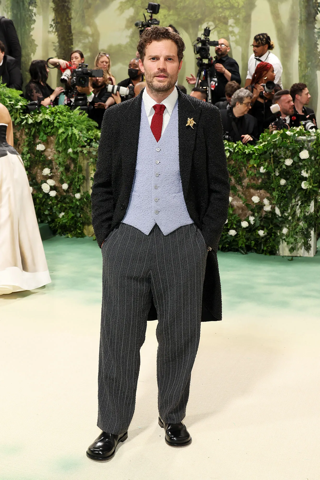 Florals were the most common feature on the red carpet. Some guests wore them in the form of 3D appliqués, like Bridgerton actor Jonathan Bailey, while others incorporated them more subtly into their looks through lapel pins and brooches, like Jack Harlow.