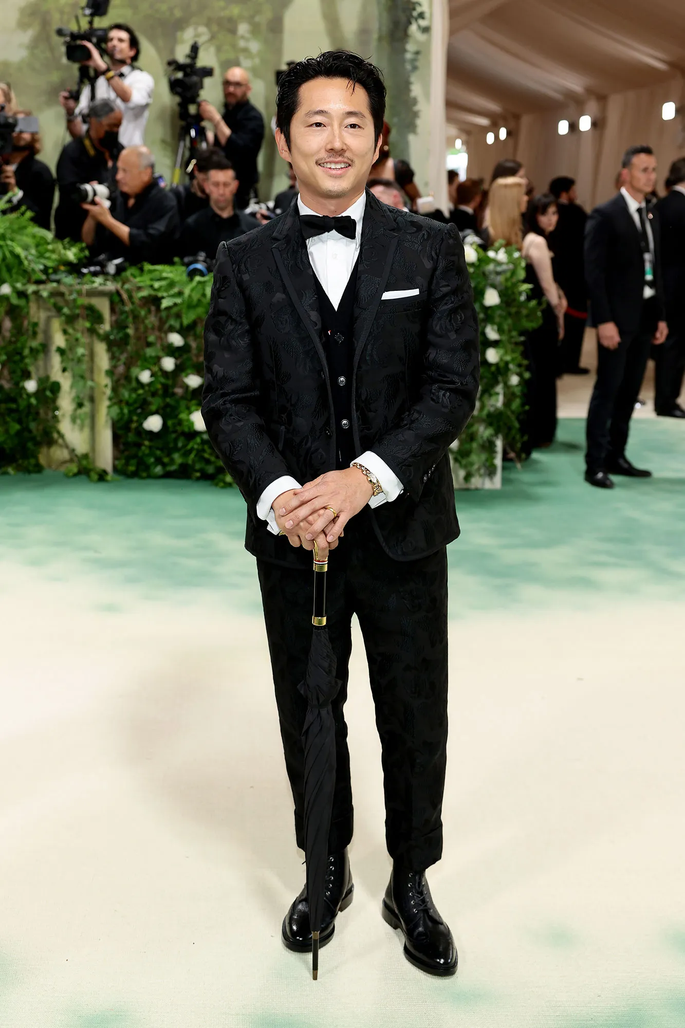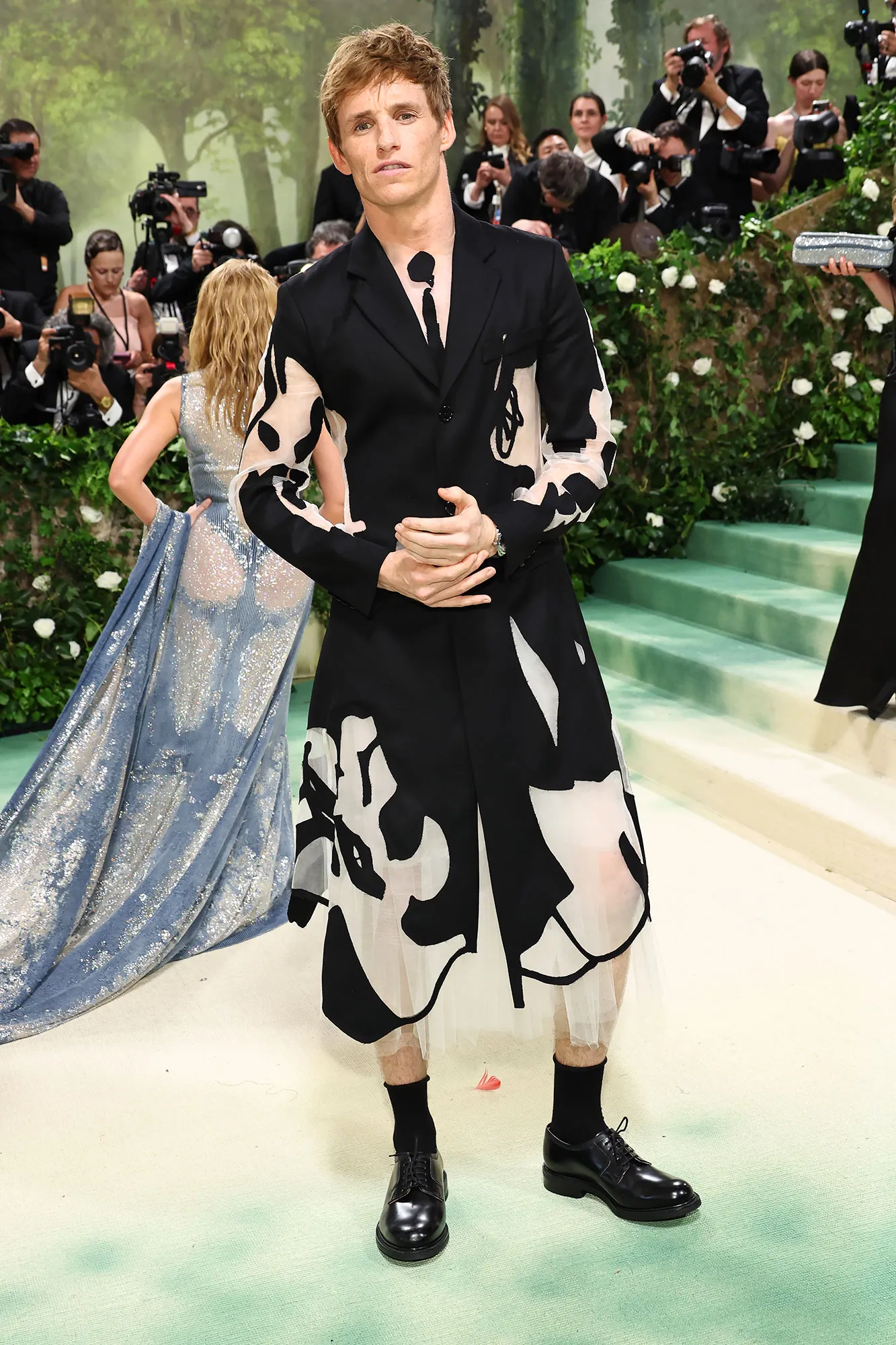 Others referenced flowers in the context of art history, like Jon Batiste. The “Freedom” singer wore a floral waistcoat underneath a custom Dunhill suit. The waistcoat’s design was a nod to the 18th century textile designer, Anna Maria Garthwaite, whose designs are on display at the Met.