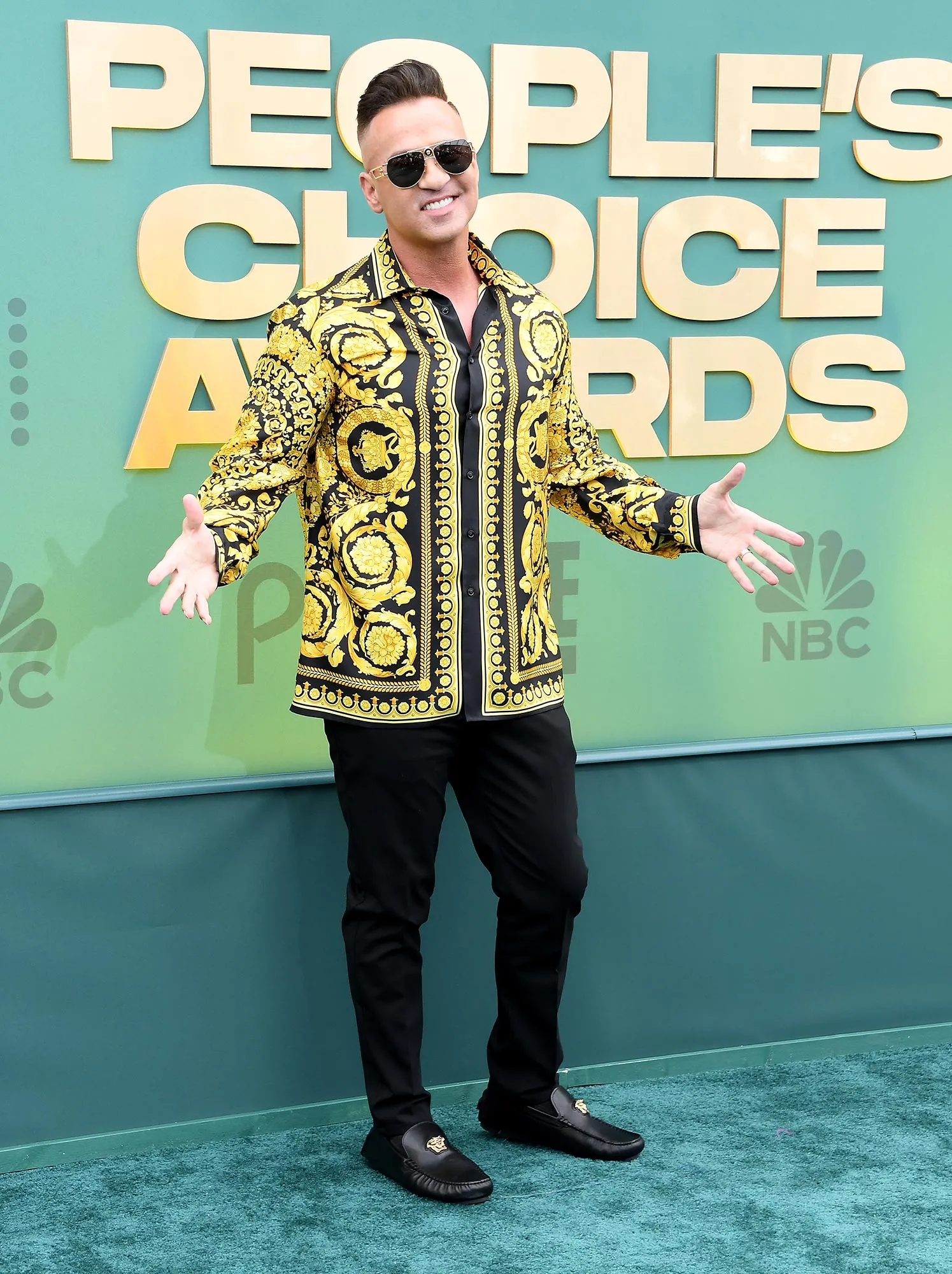 Jersey Shore’s Mike Sorrentino added a splash of color to the red carpet in a loudly patterned gold and black button down shirt, which he paired with black trousers and black loafers.