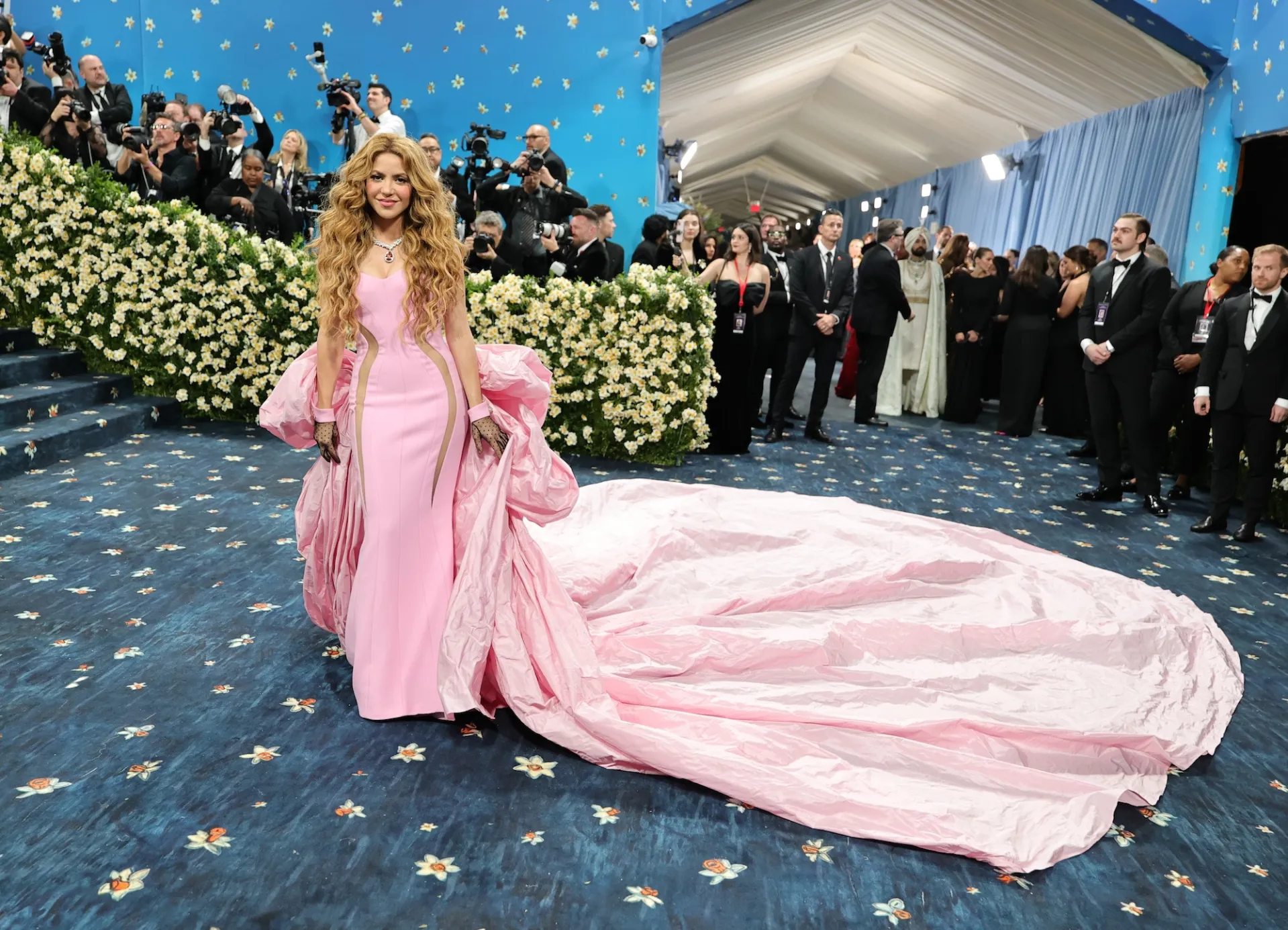 Another over-the-top moment came when Shakira stepped onto the carpet in a bubblegum pink billowing dress. The singer teamed her look with a diamond necklace and mermaid waves.