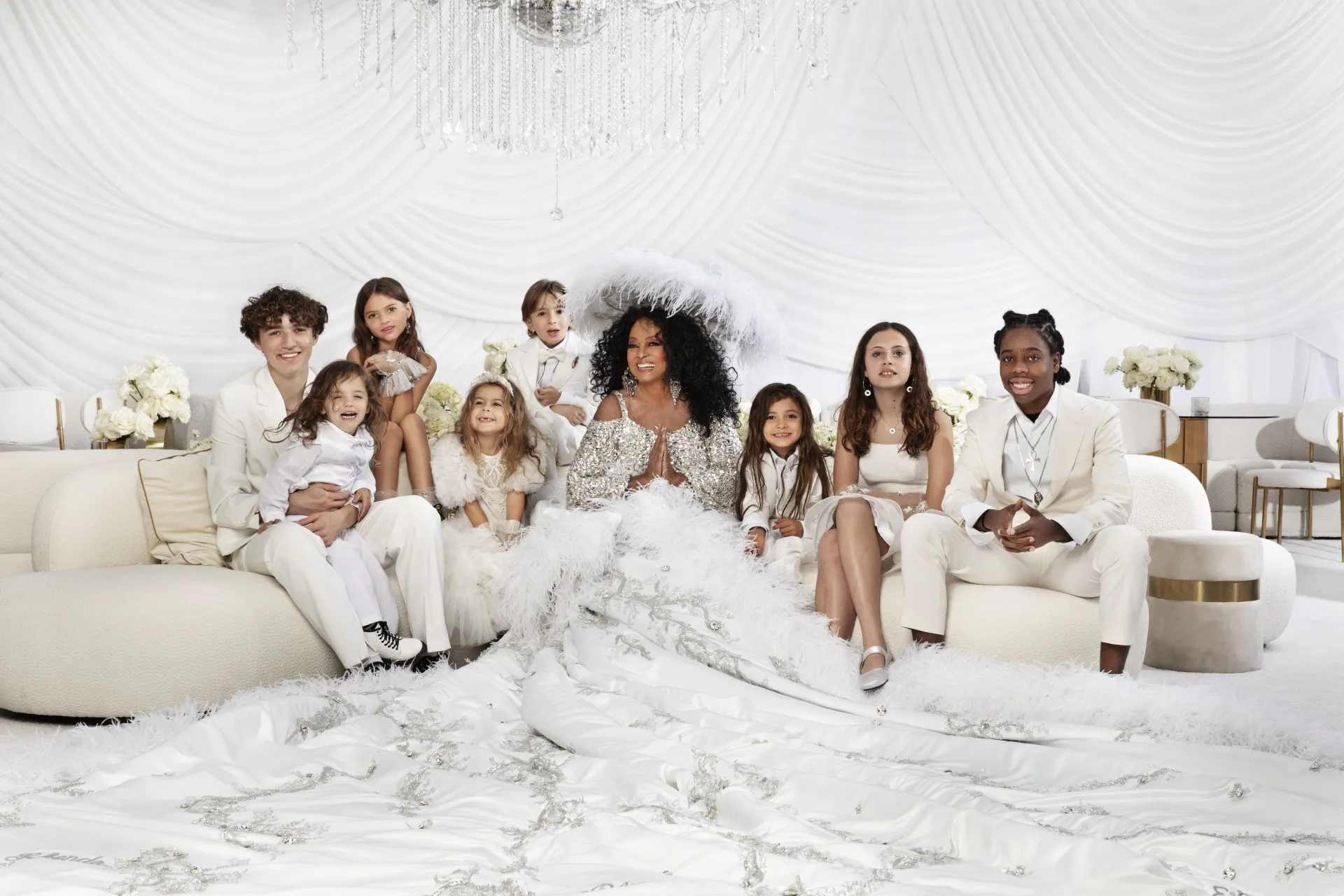 For the “Superfine: Tailoring Black Style” themed event, Ross, 81, looked as glamorous as ever in a silver crystal-embellished dress featuring a plunging neckline and fitted silhouette. The most notable part of her outfit, however, was her feather-embellished cape, which extended over the entire carpet and served as a loving family tribute.