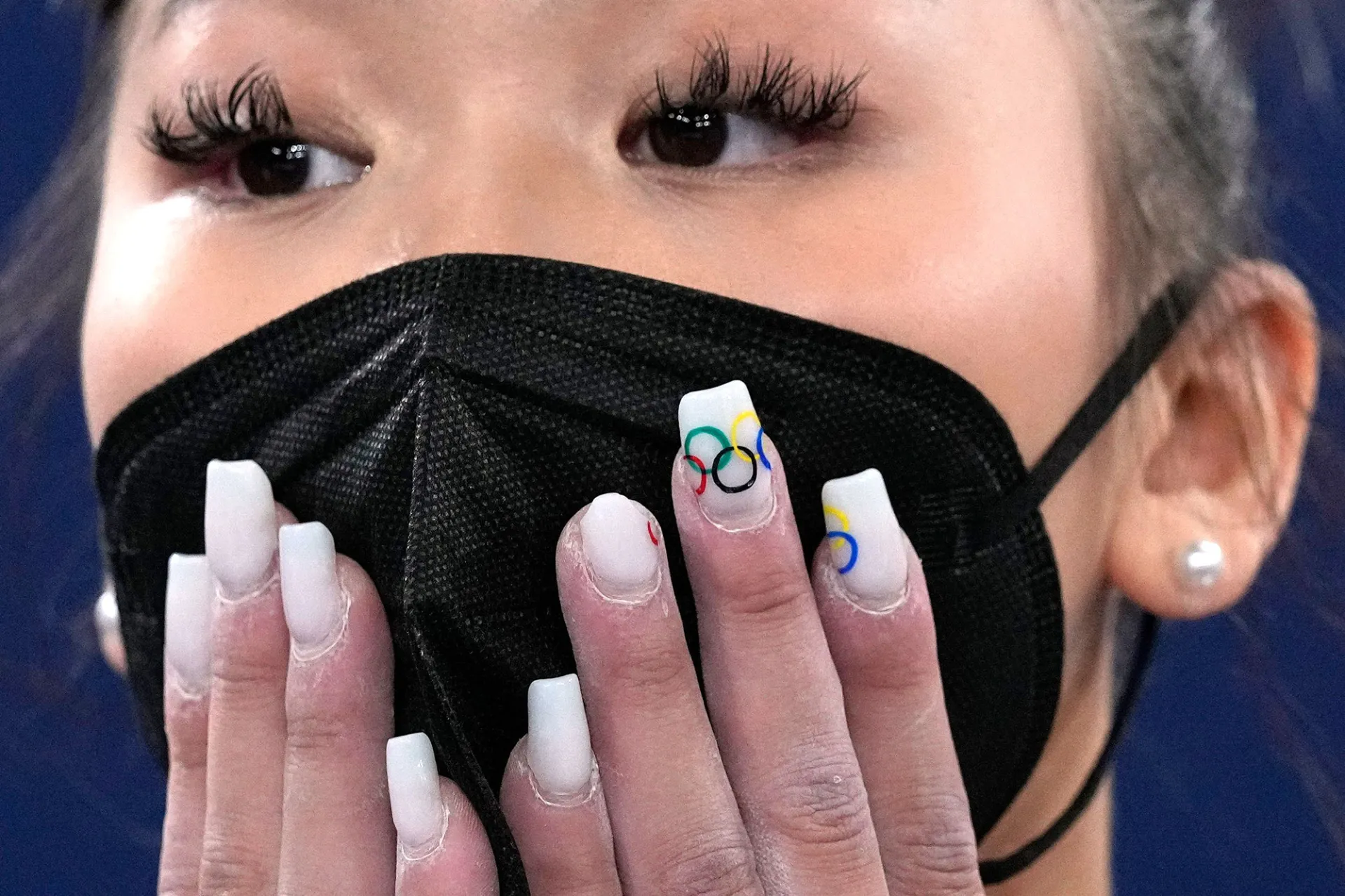 A necessary shoutout goes to Lee, who found a beauty trend that worked on the beams. The gymnast rocked long acrylics with a dainty design of the Olympic rings, which she says are “good luck.”
