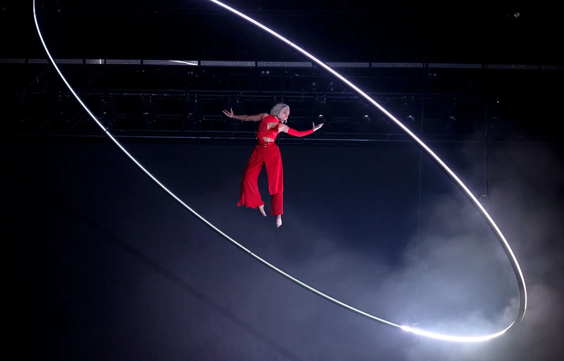 She slipped into another design by Kronthaler, this time wearing a black bustier, navy gloves and black skirt with metal detailing. The artist didn’t just swap outfits though, she completely overhauled her glam too. Think: hair, makeup, nails.