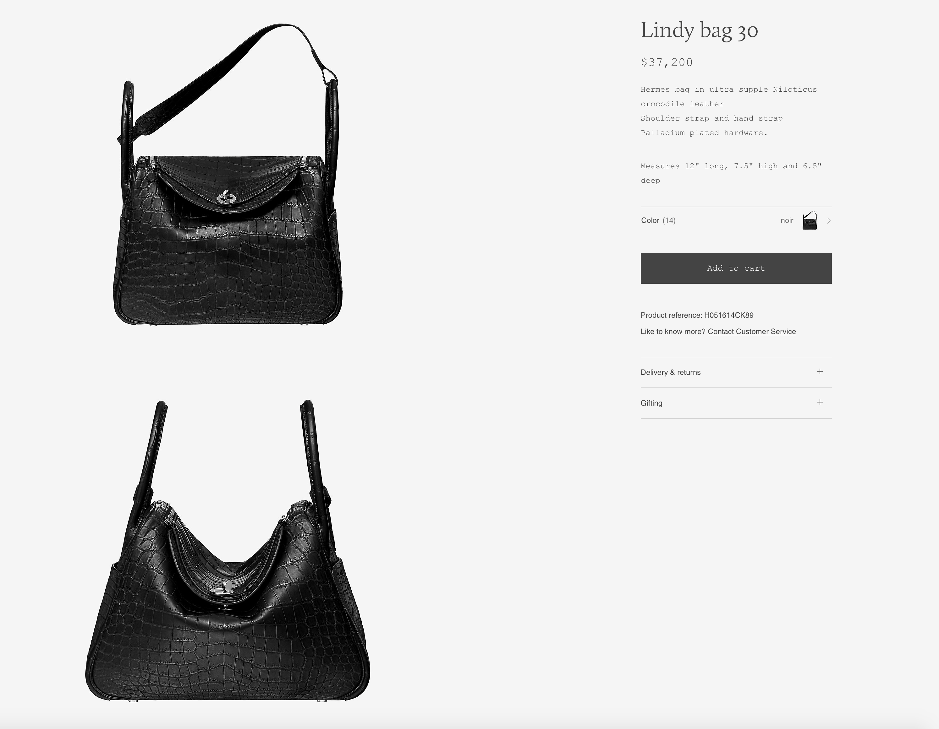 Hermès eclipses these exotics with two others. An alligator double sens is four times as much as the leather version, at a whopping $30,400. The most expensive bag on site (right now, anyway) appears to be a Lindy in Niloticus crocodile for $37,200.